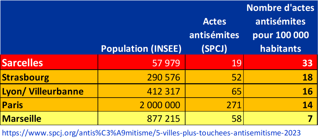 En proportion rapportée à la population, ce sont Sarcelles et Levallois qui apparaissent les plus touchées par les actes antisémites.