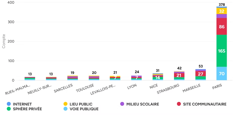 Paris, probablement en raison de sa forte population globale, d’une communauté juive nombreuse et visible, d’une plus grande exposition médiatique et sociale, concentre la majorité des actes antisémites,